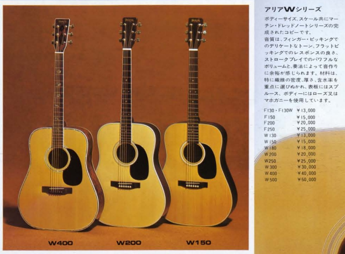 「アリアWシリーズ」は、ボディーサイズ・スケール共にマーチン・ドレッドノートシリーズの完成されたコピーです。音質は、フィンガー・ピッキングでのデリケートなトーン、フラットビ ッキングでのレスポンスの良さ、ストロークプレイでのパワフルなボリュームと、奏法によって音作りに余裕が感じられます。