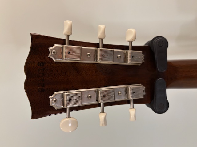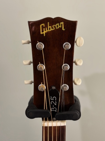 ギブソンの60年代後半らしくナット幅の狭いナローネックに、丸く白いツマミの3連ペグ、サウンドも、ナローネック時期のB-25ですので、ギブソン特融のジャキジャキのストロークサウンドは抜群です。中音域に芯の強さがあるのは小柄ながらもギブソンらしく、ボディ全体が震えるような感覚が良いです。