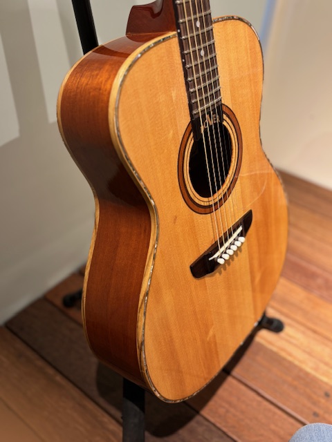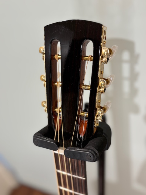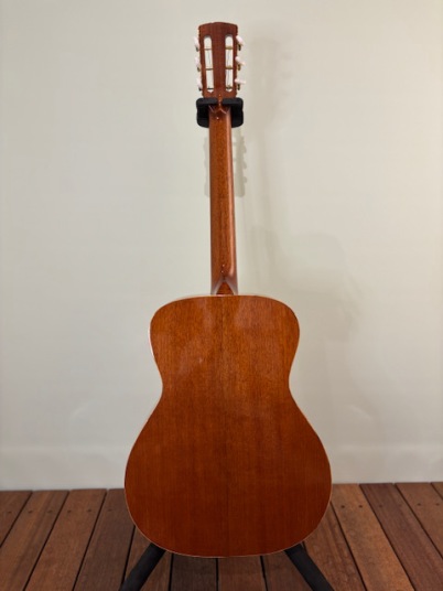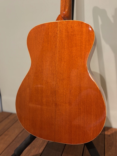 このギターは7号機となりスローテッドヘッド12フレット、クラシックギターの様相ですがホンジュラスマホガニーと2㎜厚のスプルースが醸し出す音色が素晴らしいものとなっております。。