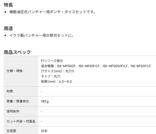 購入前のお見積書発行OK! 領収書発行・請求書事前発行のご用命も承ります "お問合せ"からお申込み下さい PROツール・ものづくりの総合商社 かんだ!TOP 切削機器・研磨機育良精機電動油圧式パンチャー電動油圧式パンチャー 替刃ISK-MP920F 替刃 育良精機 複動油圧式パンチャー替刃 丸穴 ISK-MP920F替刃 11F 51916 定価: ¥20,900(税込) 価格: ¥13,580 (税込) [ポイント還元 135ポイント~] 販売期間: 数量: 台 在庫 在庫あり 返品についての詳細はこちら