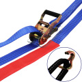 ラチェットバックル式ワッカタイプ/カギフックのラッシングベルト、握り易いバックルと柔軟強度な繊維ベルトで荷に優しく簡単安全に荷締め作業ができます。