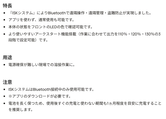 購入前のお見積書発行OK! 領収書発行・請求書事前発行のご用命も承ります "お問合せ"からお申込み下さい PROツール・ものづくりの総合商社 かんだ!TOP 切削機器・研磨機育良精機溶接機 育良精機 リチウムイオンバッテリー内蔵アーク溶接機NEO ISK-Li170ANPlus 定価: ¥803,000(税込) 価格: ¥481,800 (税込) [ポイント還元 4,818ポイント~] 販売期間: 数量: 台 在庫 在庫あり 返品についての詳細はこちら