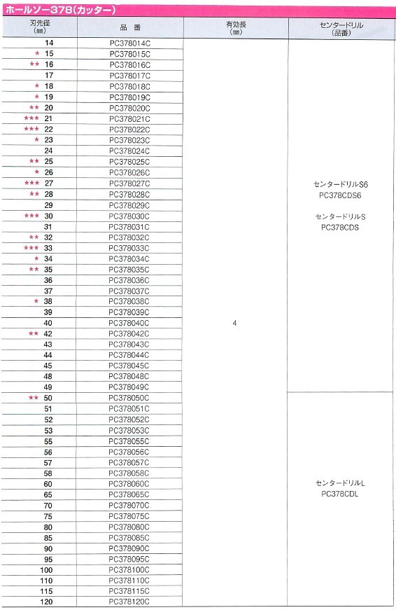 購入前のお見積書発行OK! 領収書発行・請求書事前発行のご用命も承ります "お問合せ"からお申込み下さい PROツール・ものづくりの総合商社 かんだ!TOP 切削機器・研磨機ミヤナガポリクリック シリーズホールソー378 ミヤナガ ホールソー378 PC 定価: ¥1,903(税込) ~ ¥27,060(税込) 価格: ¥920 (税込) ~ ¥13,140 (税込) [ポイント還元 9ポイント~] 販売期間: サイズ・品番: 選択してください 14mm:カッターのみ:PC378014C 15mm:カッターのみ:PC378015C 16mm:カッターのみ:PC378016C 17mm:カッターのみ:PC378017C 18mm:カッターのみ:PC378018C 19mm:カッターのみ:PC378019C 20mm:カッターのみ:PC378020C 21mm:カッターのみ:PC378021C 22mm:カッターのみ:PC378022C 23mm:カッターのみ:PC378023C 24mm:カッターのみ:PC378024C 25mm:カッターのみ:PC378025C 26mm:カッターのみ:PC378026C 27mm:カッターのみ:PC378027C 28mm:カッターのみ:PC378028C 29mm:カッターのみ:PC378029C 30mm:カッターのみ:PC378030C 31mm:カッターのみ:PC378031C 32mm:カッターのみ:PC378032C 33mm:カッターのみ:PC378033C 34mm:カッターのみ:PC378034C 35mm:カッターのみ:PC378035C 36mm:カッターのみ:PC378036C 37mm:カッターのみ:PC378037C 38mm:カッターのみ:PC378038C 39mm:カッターのみ:PC378039C 40mm:カッターのみ:PC378040C 42mm:カッターのみ:PC378042C 43mm:カッターのみ:PC378043C 44mm:カッターのみ:PC378044C 45mm:カッターのみ:PC378045C 48mm:カッターのみ:PC378048C 49mm:カッターのみ:PC378049C 50mm:カッターのみ:PC378050C 51mm:カッターのみ:PC378051C 52mm:カッターのみ:PC378052C 53mm:カッターのみ:PC378053C 55mm:カッターのみ:PC378055C 56mm:カッターのみ:PC378056C 57mm:カッターのみ:PC378057C 58mm:カッターのみ:PC378058C 60mm:カッターのみ:PC378060C 61mm:カッターのみ:PC378061C 65mm:カッターのみ:PC378065C 70mm:カッターのみ:PC378070C 75mm:カッターのみ:PC378075C 80mm:カッターのみ:PC378080C 85mm:カッターのみ:PC378085C 90mm:カッターのみ:PC378090C 95mm:カッターのみ:PC378095C 100mm:カッターのみ:PC378100C 110mm:カッターのみ:PC378110C 115mm:カッターのみ:PC378115C 120mm:カッターのみ:PC378120C センタードリルS6:PC378CDS6 センタードリルS:PCSCDS センタードリルL:PC378CDL Sシャンク ストレート:PCSKS Sシャンク SDSプラス:PCSKSR Lシャンク ストレート:PCSKL LシャンクSDSプラス:PCSKLR Xシャンク SDSプラス:PCSKXR 定価: - 価格: - 数量: 個 サイズ・品番定価価格在庫14mm:カッターのみ:PC378014C¥3,652(税込)¥1,770(税込)在庫あり15mm:カッターのみ:PC378015C¥3,652(税込)¥1,770(税込)在庫あり16mm:カッターのみ:PC378016C¥3,652(税込)¥1,770(税込)在庫あり17mm:カッターのみ:PC378017C¥3,652(税込)¥1,770(税込)在庫あり18mm:カッターのみ:PC378018C¥3,652(税込)¥1,770(税込)在庫あり19mm:カッターのみ:PC378019C¥3,652(税込)¥1,770(税込)在庫あり20mm:カッターのみ:PC378020C¥3,652(税込)¥1,770(税込)在庫あり21mm:カッターのみ:PC378021C¥3,652(税込)¥1,770(税込)在庫あり22mm:カッターのみ:PC378022C¥3,652(税込)¥1,770(税込)在庫あり23mm:カッターのみ:PC378023C¥3,652(税込)¥1,770(税込)在庫あり24mm:カッターのみ:PC378024C¥3,652(税込)¥1,770(税込)在庫あり25mm:カッターのみ:PC378025C¥3,652(税込)¥1,770(税込)在庫あり26mm:カッターのみ:PC378026C¥4,554(税込)¥2,210(税込)在庫あり27mm:カッターのみ:PC378027C¥4,554(税込)¥2,210(税込)在庫あり28mm:カッターのみ:PC378028C¥4,554(税込)¥2,210(税込)在庫あり29mm:カッターのみ:PC378029C¥4,554(税込)¥2,210(税込)在庫あり30mm:カッターのみ:PC378030C¥4,554(税込)¥2,210(税込)在庫あり31mm:カッターのみ:PC378031C¥5,610(税込)¥2,720(税込)在庫あり32mm:カッターのみ:PC378032C¥5,610(税込)¥2,720(税込)在庫あり33mm:カッターのみ:PC378033C¥5,610(税込)¥2,720(税込)在庫あり34mm:カッターのみ:PC378034C¥5,610(税込)¥2,720(税込)在庫あり35mm:カッターのみ:PC378035C¥5,610(税込)¥2,720(税込)在庫あり36mm:カッターのみ:PC378036C¥6,776(税込)¥3,290(税込)在庫あり37mm:カッターのみ:PC378037C¥6,776(税込)¥3,290(税込)在庫あり38mm:カッターのみ:PC378038C¥6,776(税込)¥3,290(税込)在庫あり39mm:カッターのみ:PC378039C¥6,776(税込)¥3,290(税込)在庫あり40mm:カッターのみ:PC378040C¥6,776(税込)¥3,290(税込)在庫あり42mm:カッターのみ:PC378042C¥8,195(税込)¥3,980(税込)在庫あり43mm:カッターのみ:PC378043C¥8,195(税込)¥3,980(税込)在庫あり44mm:カッターのみ:PC378044C¥8,195(税込)¥3,980(税込)在庫あり45mm:カッターのみ:PC378045C¥8,195(税込)¥3,980(税込)在庫あり48mm:カッターのみ:PC378048C¥9,504(税込)¥4,610(税込)在庫あり49mm:カッターのみ:PC378049C¥9,504(税込)¥4,610(税込)在庫あり50mm:カッターのみ:PC378050C¥9,504(税込)¥4,610(税込)在庫あり51mm:カッターのみ:PC378051C¥11,044(税込)¥5,360(税込)在庫あり52mm:カッターのみ:PC378052C¥11,044(税込)¥5,360(税込)在庫あり53mm:カッターのみ:PC378053C¥11,044(税込)¥5,360(税込)在庫あり55mm:カッターのみ:PC378055C¥11,044(税込)¥5,360(税込)在庫あり56mm:カッターのみ:PC378056C¥11,880(税込)¥5,770(税込)在庫あり57mm:カッターのみ:PC378057C¥11,880(税込)¥5,770(税込)在庫あり58mm:カッターのみ:PC378058C¥11,880(税込)¥5,770(税込)在庫あり60mm:カッターのみ:PC378060C¥11,880(税込)¥5,770(税込)在庫あり61mm:カッターのみ:PC378061C¥12,837(税込)¥6,230(税込)在庫あり65mm:カッターのみ:PC378065C¥12,837(税込)¥6,230(税込)在庫あり70mm:カ