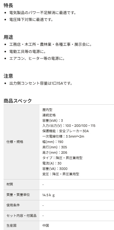 購入前のお見積書発行OK! 領収書発行・請求書事前発行のご用命も承ります "お問合せ"からお申込み下さい PROツール・ものづくりの総合商社 かんだ!TOP 切削機器・研磨機育良精機トランス 育良精機 ポータブルトランス 昇降圧兼用 3kVA PT-30T 定価: ¥49,500(税込) 価格: ¥32,170 (税込) [ポイント還元 321ポイント~] 販売期間: 数量: 台 在庫 在庫あり 返品についての詳細はこちら
