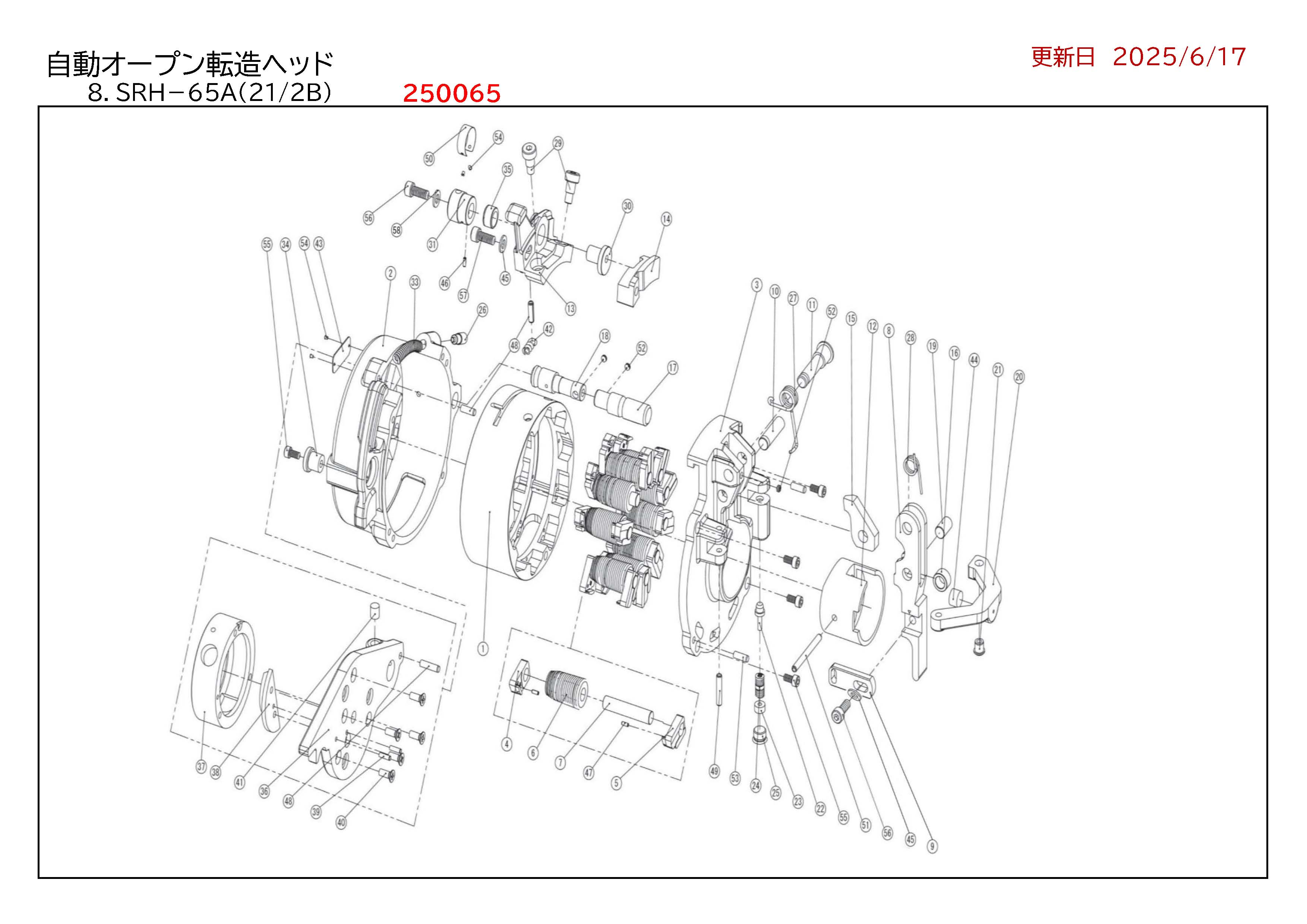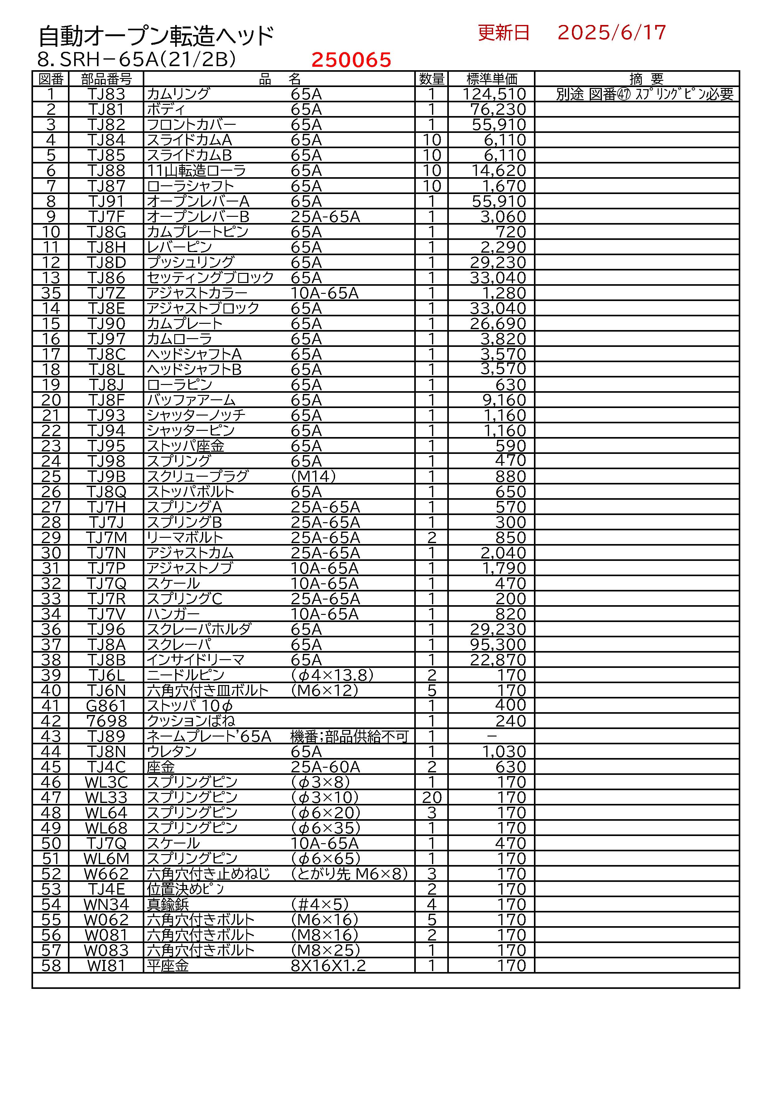購入前のお見積書発行OK! 領収書発行・請求書事前発行のご用命も承ります "お問合せ"からお申込み下さい PROツール・ものづくりの総合商社 かんだ!TOP パイプマシンREX パイプマシンREX パイプマシン部品一覧自動オープン転造ヘッドSRH-65A REX 自動オープン転造ヘッド SRH-65A(2.1/2B) 価格: ¥187 (税込) ~ ¥136,961 (税込) [ポイント還元 1ポイント~] 販売期間: 図番: 選択してください 1:TJ83 カムリング 65A 2:TJ81 ボディ 65A 3:TJ82 フロントカバー 65A 4:TJ84 スライドカムA 65A 5:TJ85 スライドカムB 65A 6:TJ88 11山転造ローラ 65A 7:TJ87 ローラシャフト 65A 8:TJ91 オープンレバーA 65A 9:TJ7F オープンレバーB 25A-65A 10:TJ8G カムプレートピン 65A 11:TJ8H レバーピン 65A 12:TJ8D プッシュリング 65A 13:TJ86 セッティングブロック 65A 35:TJ7Z アジャストカラー 10A-65A 14:TJ8E アジャストブロック 65A 15:TJ90 カムプレート 65A 16:TJ97 カムローラ 65A 17:TJ8C ヘッドシャフトA 65A 18:TJ8L ヘッドシャフトB 65A 19:TJ8J ローラピン 65A 20:TJ8F バッファアーム 65A 21:TJ93 シャッターノッチ 65A 22:TJ94 シャッターピン 65A 23:TJ95 ストッパ座金 65A 24:TJ98 スプリング 65A 25:TJ9B スクリュープラグ (M14) 26:TJ8Q ストッパボルト 65A 27:TJ7H スプリングA 25A-65A 28:TJ7J スプリングB 25A-65A 29:TJ7M リーマボルト 25A-65A 30:TJ7N アジャストカム 25A-65A 31:TJ7P アジャストノブ 10A-65A 32:TJ7Q スケール 10A-65A 33:TJ7R スプリングC 25A-65A 34:TJ7V ハンガー 10A-65A 36:TJ96 スクレーパホルダ 65A 37:TJ8A スクレーパ 65A 38:TJ8B インサイドリーマ 65A 39:TJ6L ニードルピン (φ4×13.8) 40:TJ6N 六角穴付き皿ボルト (M6×12) 41:G861 ストッパ 10φ 42:7698 クッションばね 機番;部品供給不可 44:TJ8N ウレタン 25A-60A 45:TJ4C 座金 (φ3×8) 46:WL3C スプリングピン (φ3×10) 47:WL33 スプリングピン (φ6×20) 48:WL64 スプリングピン (φ6×35) 49:WL68 スプリングピン 10A-65A 50:TJ7Q スケール (φ6×65) 51:WL6M スプリングピン (とがり先 M6×8) 52:W662 六角穴付き止めねじ (#4×5) 53:TJ4E 位置決めピン (M6×16) 54:WN34 真鍮鋲 (M8×16) 55:W062 六角穴付きボルト (M8×25) 56:W081 六角穴付きボルト 8X16X1.2 57:W083 六角穴付きボルト 58:WI81 平座金 価格: - 数量: 個 図番価格在庫1:TJ83 カムリング 65A¥136,961(税込)在庫あり2:TJ81 ボディ 65A¥83,853(税込)在庫あり3:TJ82 フロントカバー 65A¥61,501(税込)在庫あり4:TJ84 スライドカムA 65A¥6,721(税込)在庫あり5:TJ85 スライドカムB 65A¥6,721(税込)在庫あり6:TJ88 11山転造ローラ 65A¥16,082(税込)在庫あり7:TJ87 ローラシャフト 65A¥1,837(税込)在庫あり8:TJ91 オープンレバーA 65A¥61,501(税込)在庫あり9:TJ7F オープンレバーB 25A-65A¥3,366(税込)在庫あり10:TJ8G カムプレートピン 65A¥792(税込)在庫あり11:TJ8H レバーピン 65A¥2,519(税込)在庫あり12:TJ8D プッシュリング 65A¥32,153(税込)在庫あり13:TJ86 セッティングブロック 65A¥36,344(税込)在庫あり35:TJ7Z アジャストカラー 10A-65A¥1,408(税込)在庫あり14:TJ8E アジャストブロック 65A¥36,344(税込)在庫あり15:TJ90 カムプレート 65A¥29,359(税込)在庫あり16:TJ97 カムローラ 65A¥4,202(税込)在庫あり17:TJ8C ヘッドシャフトA 65A¥3,927(税込)在庫あり18:TJ8L ヘッドシャフトB 65A¥3,927(税込)在庫あり19:TJ8J ローラピン 65A¥693(税込)在庫あり20:TJ8F バッファアーム 65A¥10,076(税込)在庫あり21:TJ93 シャッターノッチ 65A¥1,276(税込)在庫あり22:TJ94 シャッターピン 65A¥1,276(税込)在庫あり23:TJ95 ストッパ座金 65A¥649(税込)在庫あり24:TJ98 スプリング 65A¥517(税込)在庫あり25:TJ9B スクリュープラグ (M14)¥968(税込)在庫あり26:TJ8Q ストッパボルト 65A¥715(税込)在庫あり27:TJ7H スプリングA 25A-65A¥627(税込)在庫あり28:TJ7J スプリングB 25A-65A¥330(税込)在庫あり29:TJ7M リーマボルト 25A-65A¥935(税込)在庫あり30:TJ7N アジャストカム 25A-65A¥2,244(税込)在庫あり31:TJ7P アジャストノブ 10A-65A¥1,969(税込)在庫あり32:TJ7Q スケール 10A-65A¥517(税込)在庫あり33:TJ7R スプリングC 25A-65A¥220(税込)在庫あり34:TJ7V ハンガー 10A-65A¥902(税込)在庫あり36:TJ96 スクレーパホルダ 65A¥32,153(税込)在庫あり37:TJ8A スクレーパ 65A¥104,830(税込)在庫あり38:TJ8B インサイドリーマ 65A¥25,157(税込)在庫あり39:TJ6L ニードルピン (φ4×13.8)¥187(税込)在庫あり40:TJ6N 六角穴付き皿ボルト (M6×12)¥187(税込)在庫あり41:G861 ストッパ 10φ¥440(税込)在庫あり42:7698 クッションばね 機番;部品供給不可¥264(税込)在庫あり44:TJ8N ウレタン 25A-60A¥1,133(税込)在庫あり45:TJ4C 座金 (φ3×8)¥693(税込)在庫あり46:WL3C スプリングピン (φ3×10)¥187(税込)在庫あり47:WL33 スプリングピン (φ6×20)¥187(税込)在庫あり48:WL64 スプリングピン (φ6×35)¥187(税込)在庫あり49:WL68 スプリングピン 10A-65A¥187(税込)在庫あり50:TJ7Q スケール (φ6×65)¥517(税込)在庫あり51:WL6M スプリングピン (とがり先 M6×8)¥187(税込)在庫あり52:W662 六角穴付き止めねじ (#4×5)¥187(税込)在庫あり53:TJ4E 位置決めピン (M6×16)¥187(税込)在庫あり54:WN34 真鍮鋲 (M8×16)¥187(税込)在庫あり55:W062 六角穴付きボルト (M8×25)¥187(税込)在庫あり56:W081 六角穴付きボルト 8X16X1.2¥187(税込)在庫あり57:W083 六角穴付きボルト¥187(税込)在庫あり58:WI81 平座金¥187(税込)在庫あり 返品についての詳細はこちら 展開図面、部品表をご確認くださ