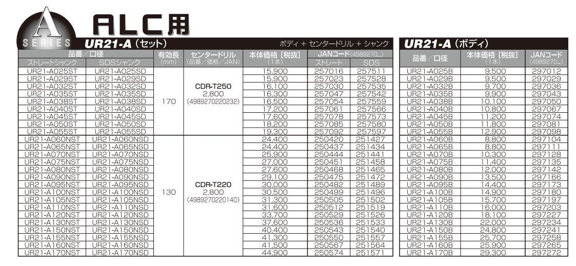 | 170mm:UR21-A170NSD:SDSシャンク | ¥50,930(税込) | ¥25,660(税込) | 在庫あり |