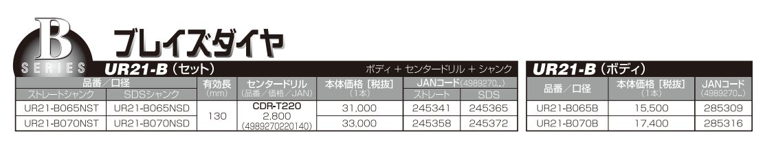 購入前のお見積書発行OK! 領収書発行・請求書事前発行のご用命も承ります "お問合せ"からお申込み下さい PROツール・ものづくりの総合商社 かんだ!TOP 切削機器・研磨機ユニカ多機能コアドリル UR21Bシリーズ ブレイズダイヤ ユニカ 多機能コアドリル Bシリーズ ブレイズダイヤ 定価: ¥17,600(税込) ~ ¥37,510(税込) 価格: ¥8,860 (税込) ~ ¥18,890 (税込) [ポイント還元 88ポイント~] 販売期間: 口径(mm):品番: 選択してください 65mm:UR21-B065NST:ストレートシャンク 70mm:UR21-B070NST:ストレートシャンク 65mm:UR21-B065NSD:SDSシャンク 70mm:UR21-B070NSD:SDSシャンク 65mm:UR21-B065B:ボディのみ 70mm:UR21-B070B:ボディのみ 定価: - 価格: - 数量: 個 口径(mm):品番定価価格在庫65mm:UR21-B065NST:ストレートシャンク¥35,310(税込)¥17,790(税込)在庫あり70mm:UR21-B070NST:ストレートシャンク¥37,510(税込)¥18,890(税込)在庫あり65mm:UR21-B065NSD:SDSシャンク¥35,310(税込)¥17,790(税込)在庫あり70mm:UR21-B070NSD:SDSシャンク¥37,510(税込)¥18,890(税込)在庫あり65mm:UR21-B065B:ボディのみ¥17,600(税込)¥8,860(税込)在庫あり70mm:UR21-B070B:ボディのみ¥19,800(税込)¥9,970(税込)在庫あり 返品についての詳細はこちら